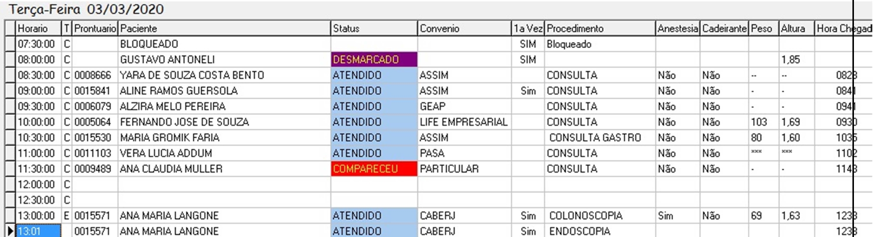 Agenda rápida e intuitiva que mostra o status do paciente: atendido, desmarcado ou aguardando na sala de espera.