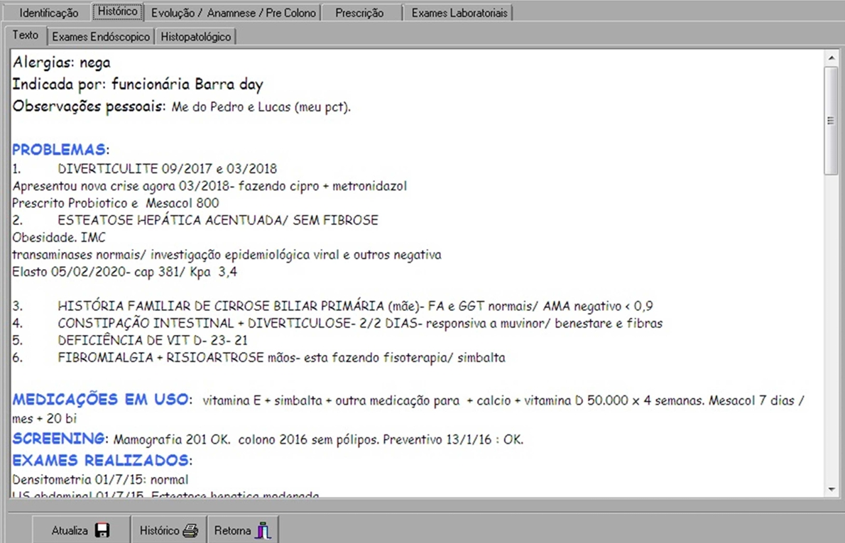 O sistema realiza a coleta de todas as informações do paciente, procedimentos realizados, prescrições e lançamentos financeiros.